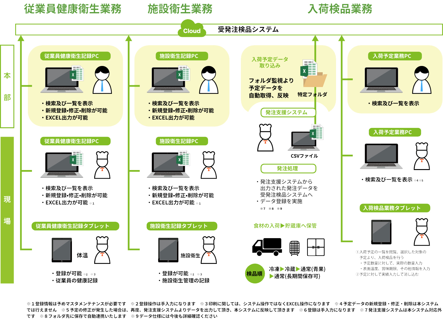 ヘルスケア施設における給食サービスの「食材の入荷管理業務」と「衛生管理業務」について、手書き運用の改善、作業精度と効率の向上を目的とします。